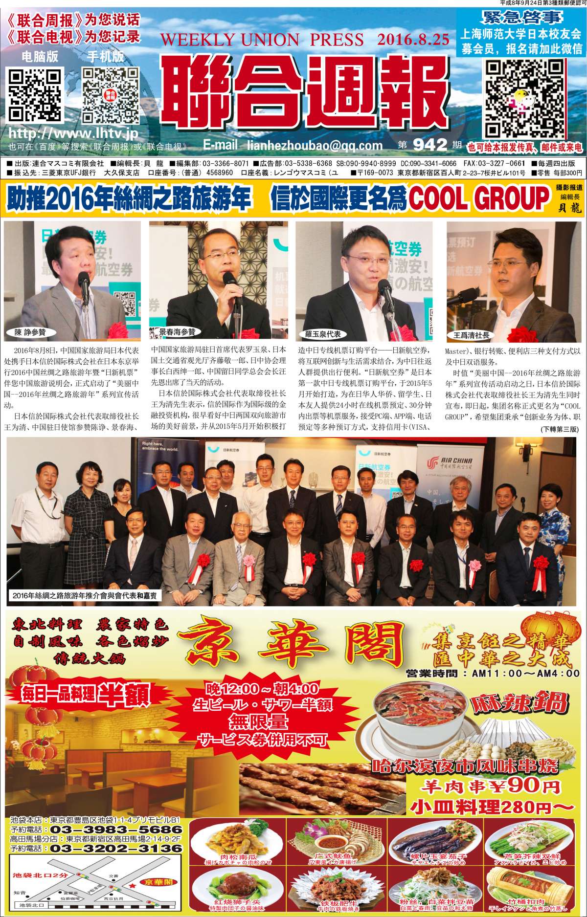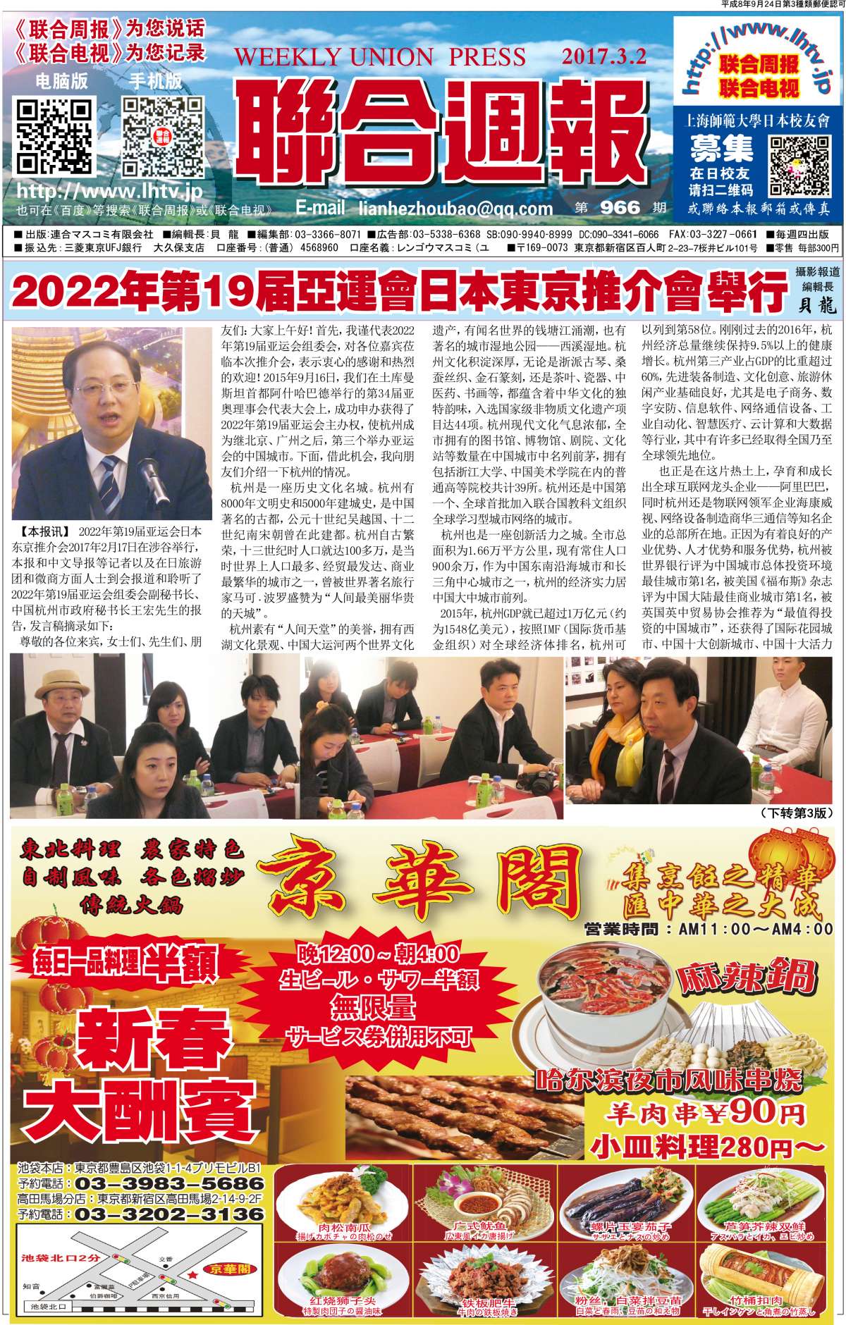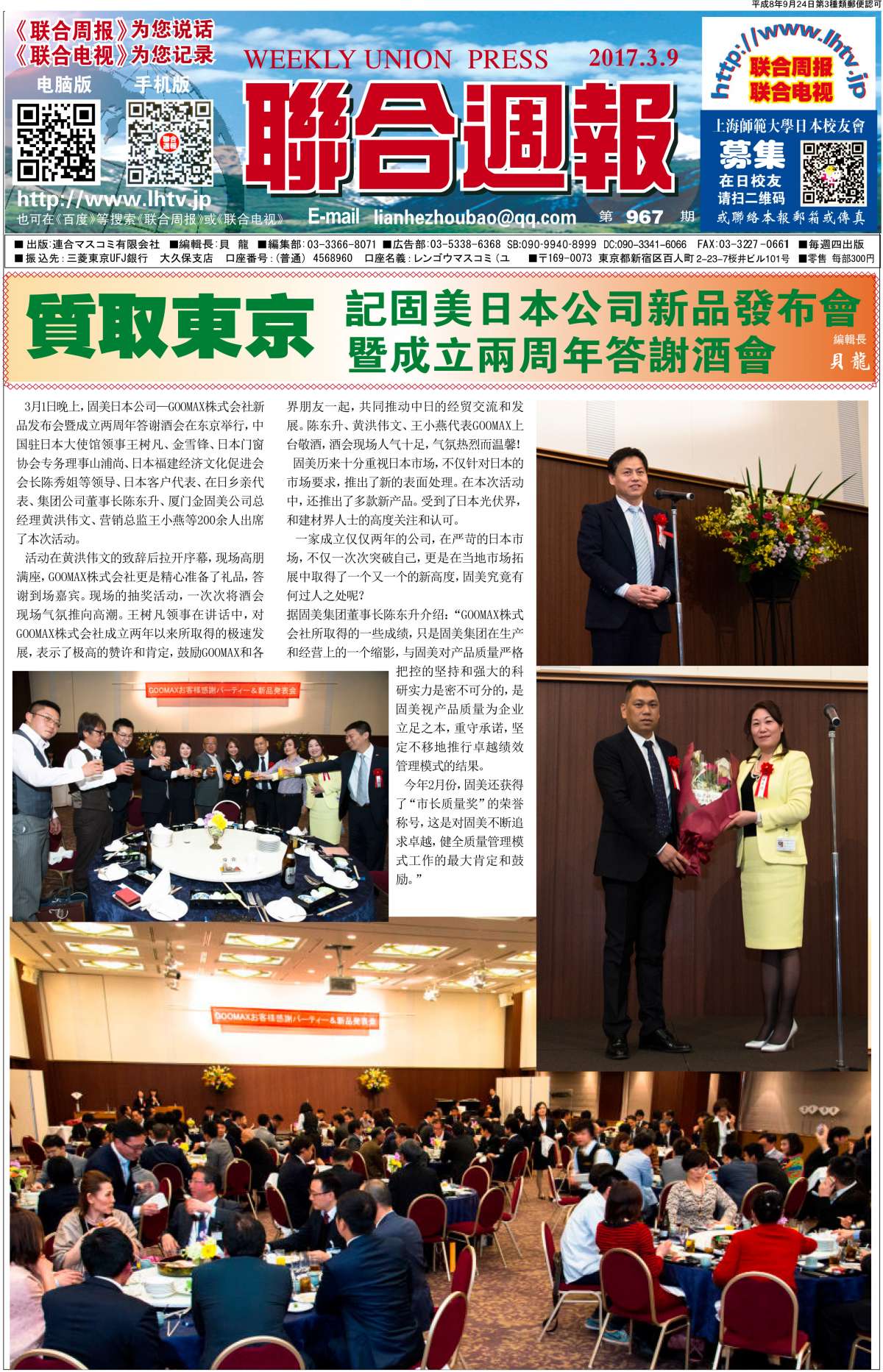 地址:東京都新宿区百人町2-23-7-101 电话:03-3366-8071 090-9940-8999(SoftBank) 传真:03-3227-0661 E-mail:weeknews@hotmail.co.jp QQ:94227298